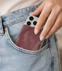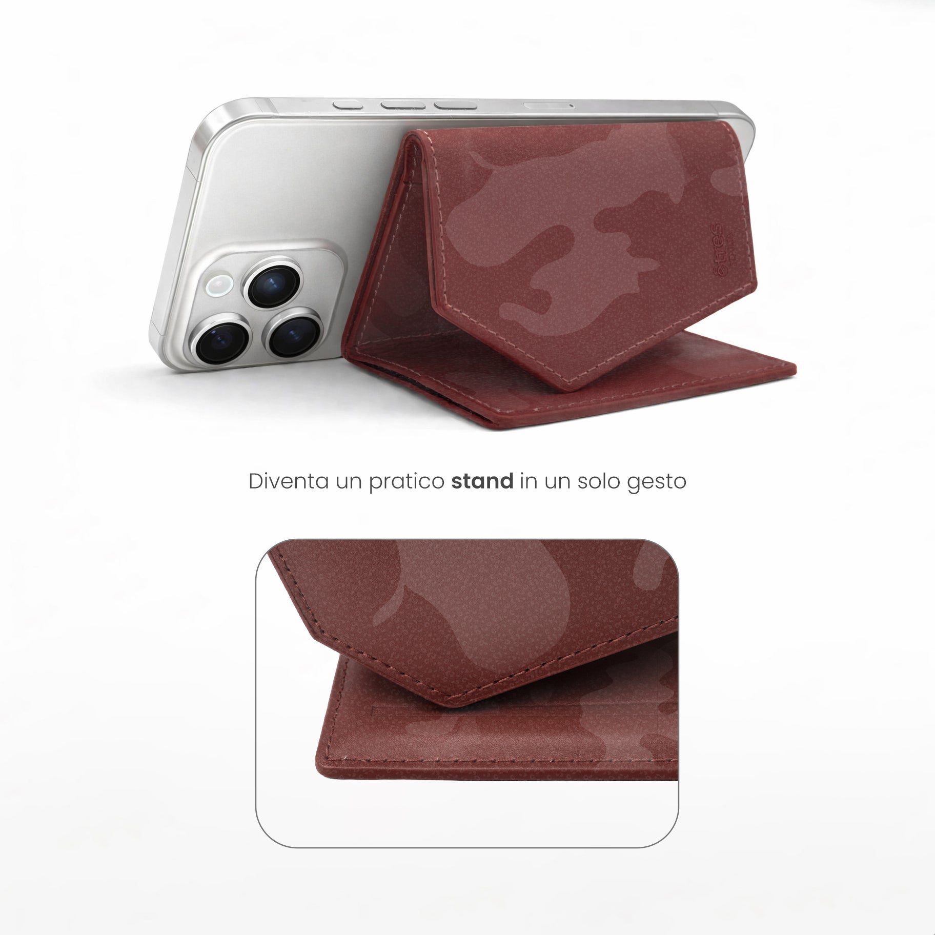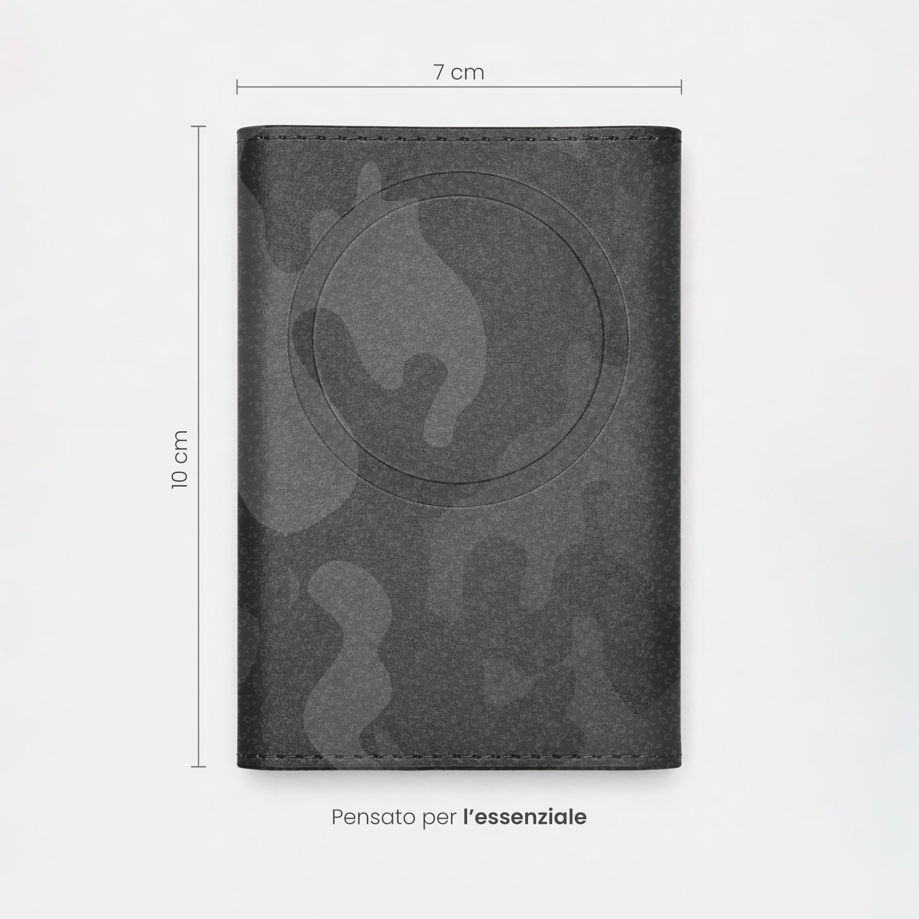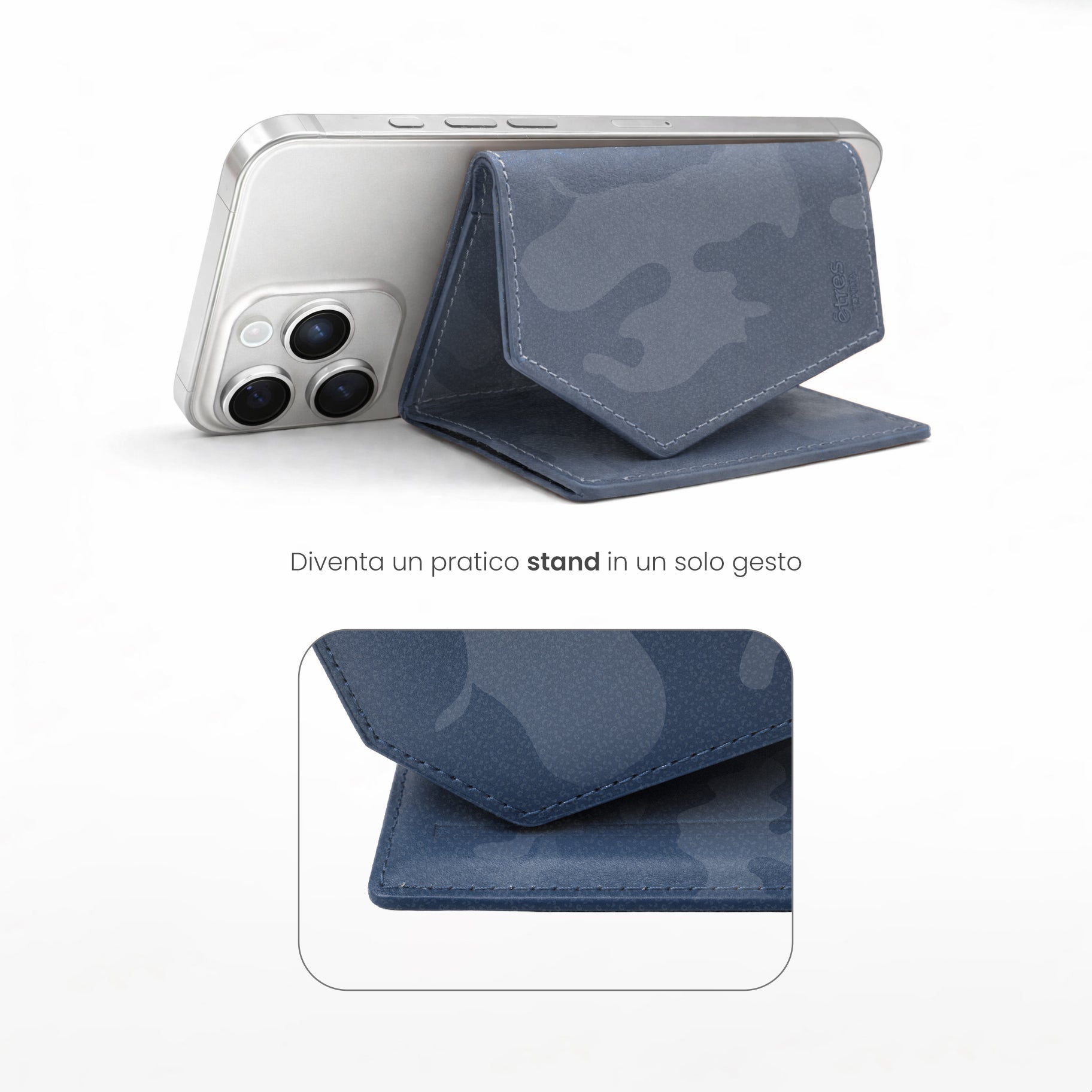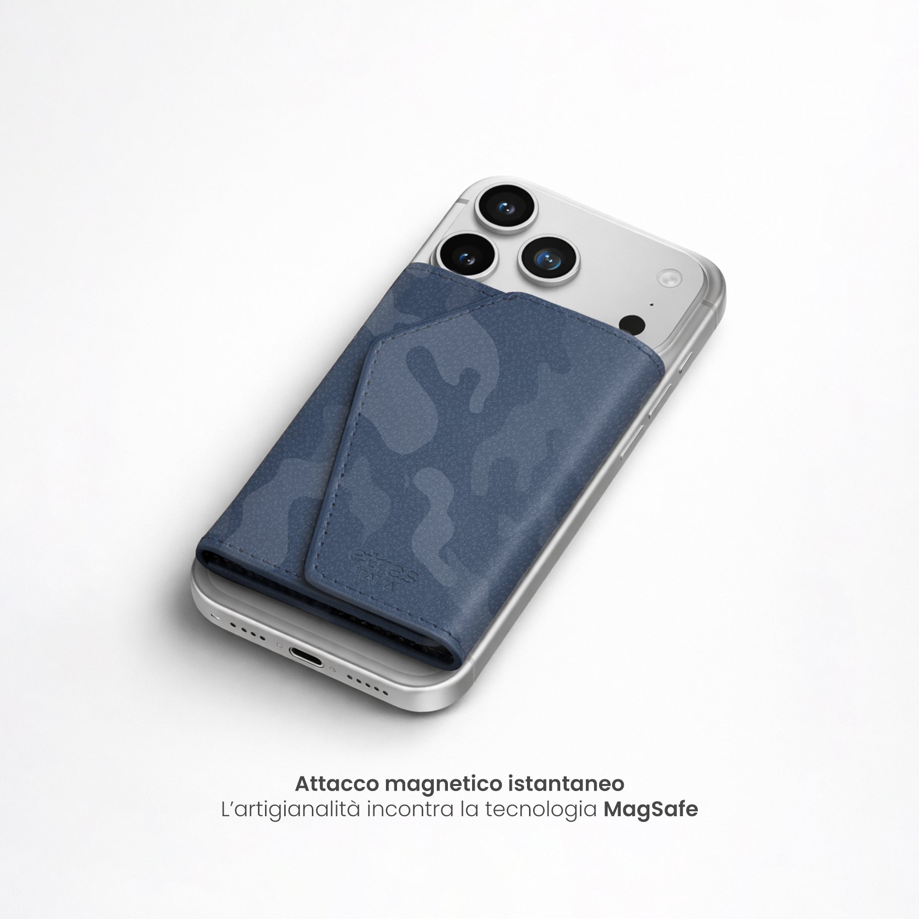 Un classico rivisitato per l'uomo contemporaneo. Il Roma Camouflage di Êtres si applica magneticamente al retro del telefono con un semplice gesto, adattandosi a qualsiasi dispositivo grazie all'accessorio in dotazione.