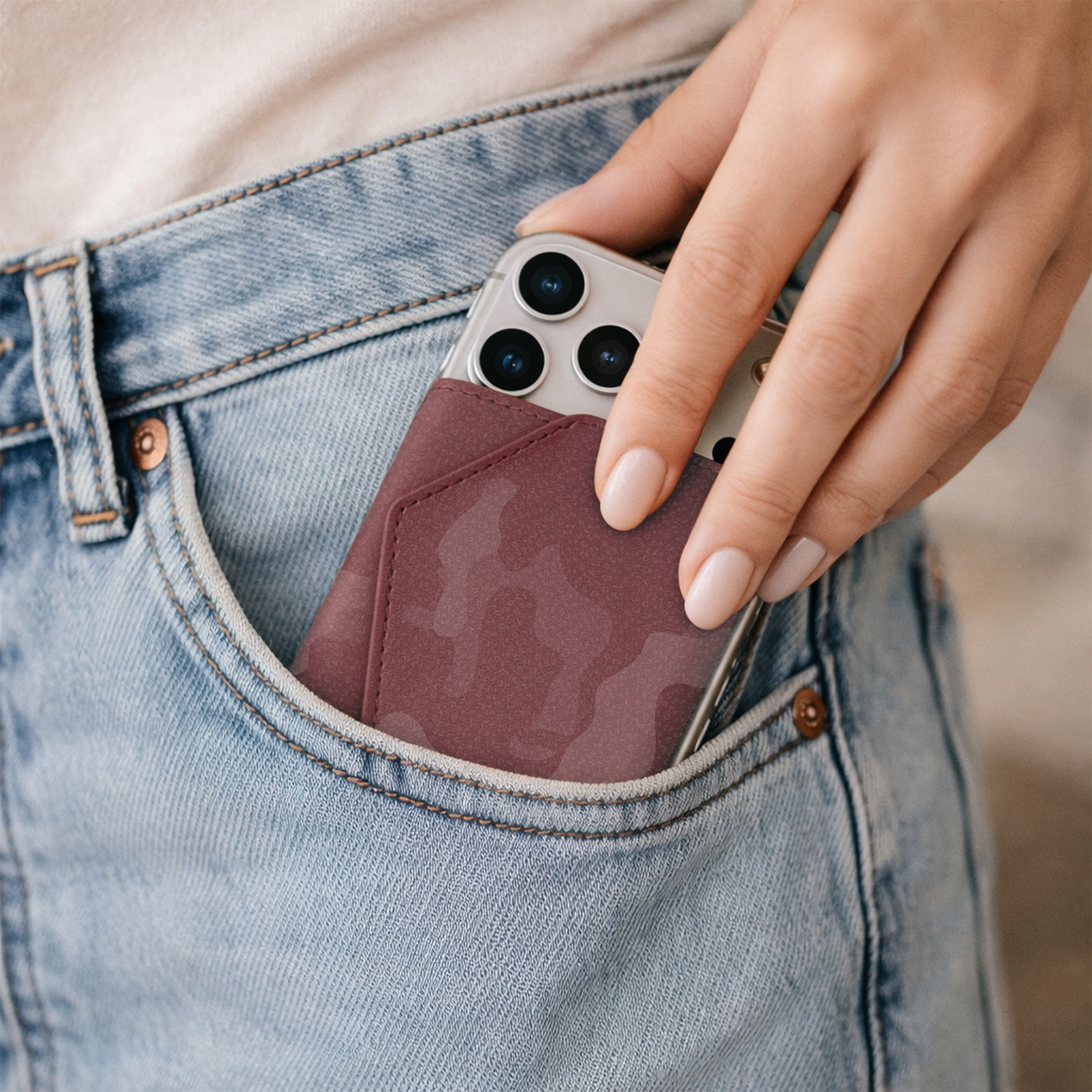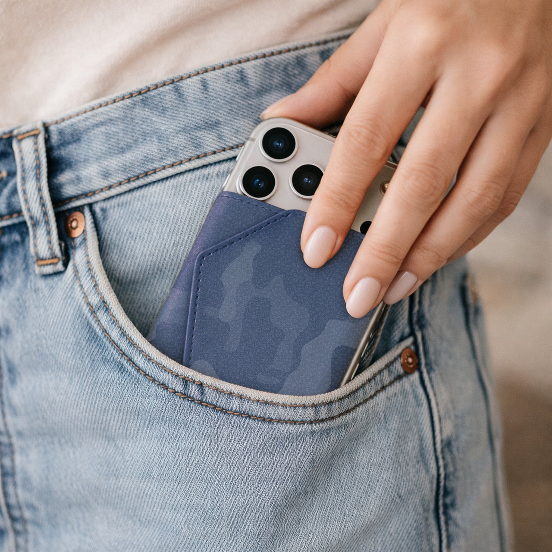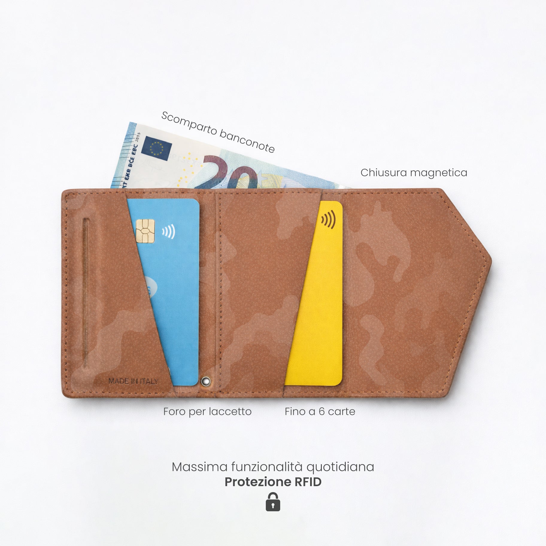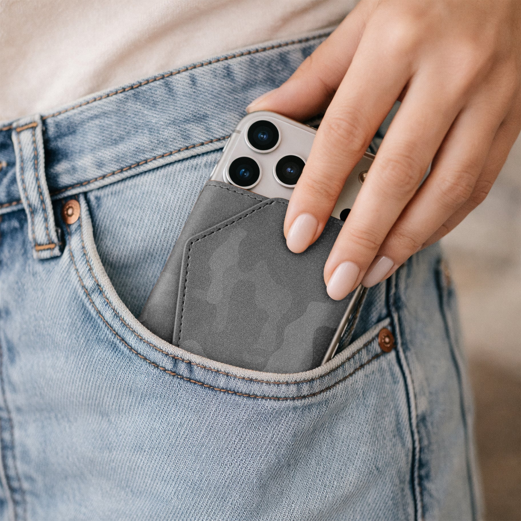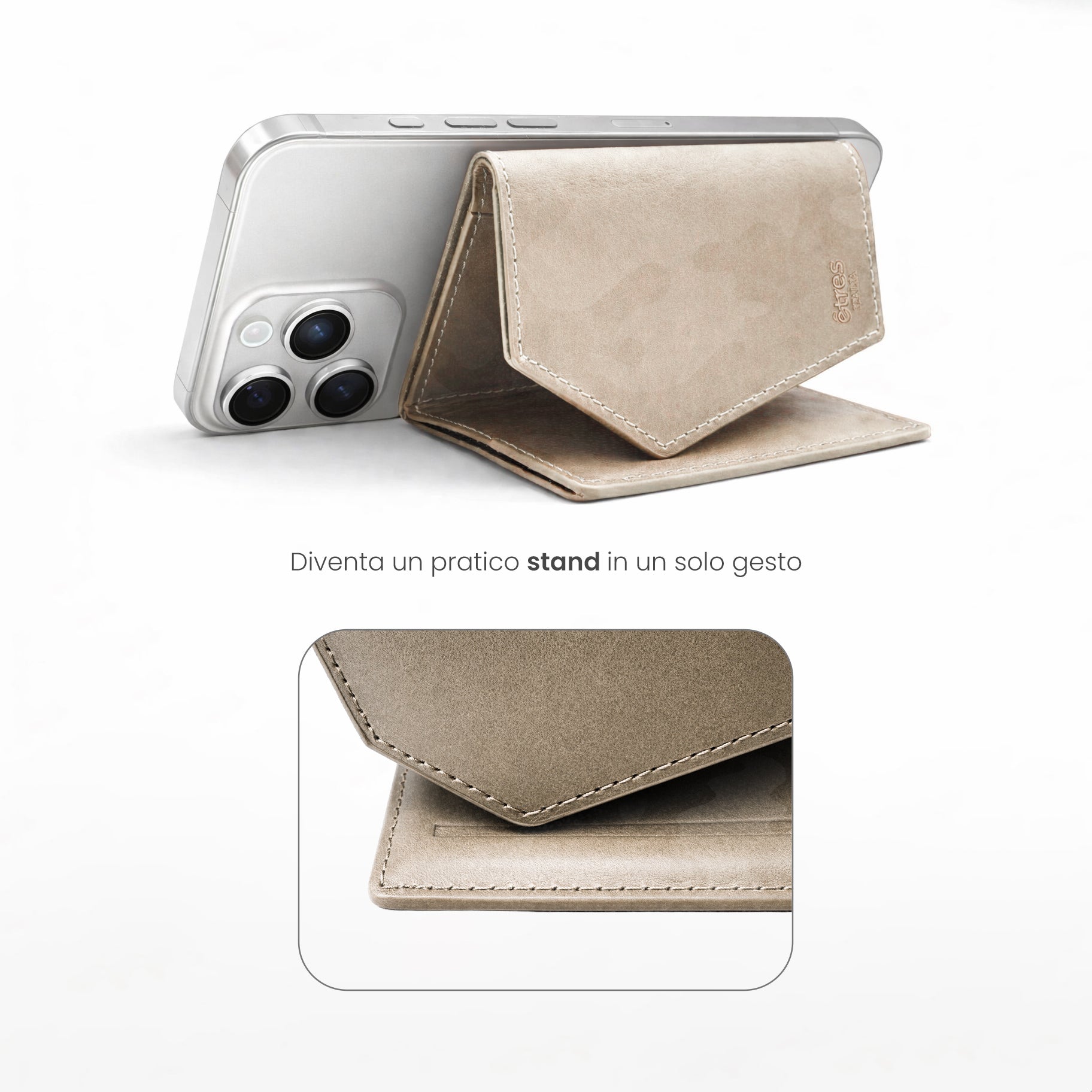 Un classico rivisitato per l'uomo contemporaneo. Il Roma Camouflage di Êtres si applica magneticamente al retro del telefono con un semplice gesto, adattandosi a qualsiasi dispositivo grazie all'accessorio in dotazione.